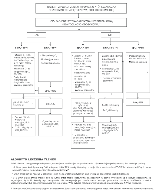 Czyż to nie brzmi fantastycznie? Wydaje się, że osoba cierpiąca na bezdech senny (mająca epizody denaturacji w nocy) powinna tym bardziej odczuwać pozytywne efekty wdychania czystego tlenu. Ale czy oby na pewno. Saturacja (SpO2) u zdrowej u osoby wynosi 95-99%. Jasno z tego wynika, że w normalnych warunkach nie możemy już istotnie poprawić wysycenia krwi tlenem, niezależnie od tego ile go podamy we wdychanej mieszance. Okazjonalne podanie tlenu nie powinno może szczególnie zaszkodzić ale też nie ma prawa pomóc. Nie odczujecie większej ilości energii, poprawy samopoczucia, nie przyspieszy wam metabolizm czy wydolność organizmu. Jeżeli ktoś odczuwał takie skutki po wizycie w barze tlenowym to albo nie wiedział wcześniej o tym, że ma niewydolność oddechową… albo- co bardziej prawdopodobne- odczuł efekt placebo. Inna sprawa, że prawdopodobnie dawki tlenu w takich barach pewnie i tak dla bezpieczeństwa i ze względu na kiepski sprzęt będą „homeopatyczne”. Jak zauważycie, że już na samej górze schematu jest różnicowanie czy obniżona saturacja nie jest wynikiem hiperkapnii (podwyższonego stężenia CO2 we krwi). Jest to niezmiernie ważne, ponieważ u takich osób podanie dużego stężenia tlenu może wywołać efekt odwrotny od zamierzonego i być skrajnie niebezpieczne. Pokazuję Wam to aby uzmysłowić fakt, że samodzielne stosowanie tlenoterapii, nawet (a może przede wszystkim) gdy stwierdzicie u siebie obniżenie saturacji pulsoksymetrem albo po prostu przy dusznościach, może być na prawdę kiepskim pomysłem.