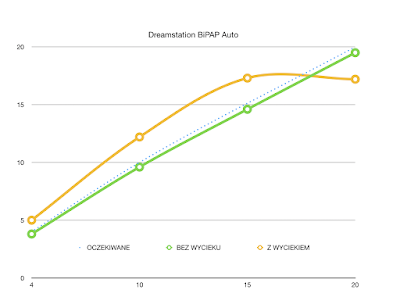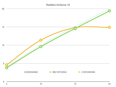 Jak widać w tym przypadku faktycznie BiPAP poradził sobie znacznie lepiej na wysokich ciśnieniach/ wycieku. Wygląda, że urządzenie jest w stanie wygenerować większe przepływy w górnym zakresie ciśnień.