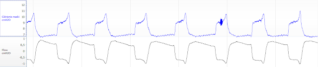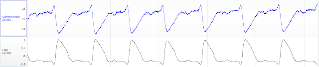 and also Blue from DeVilbiss (here the expiratory and inspiratory pause is beautifully outlined, but the device again has a problem with „letting go” and is therefore perceived as uncomfortable). The fluctuation in the graph may have been snoring, which has not been completely eliminated in this device.