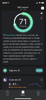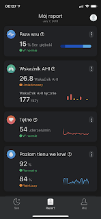 Równocześnie sama ilość spadków saturacji nie jest wskaźnikiem pozbawionym sensu. Wolałbym oczywiście aby pokazany były epizody ze zbyt niską saturacją, spadki o wartość 4% albo czas spędzony w desaturacji… ale sama ilość spadków też nam może sporo powiedzieć o jakości snu. Dla osób zdrowych to może być nawet z pewnych względów lepszy wskaźnik, bo jest bardziej „czuły”. Tak więc moim zdaniem producent zupełnie niepotrzebnie poszedł na łatwiznę. Prawdopodobnie zdecydowano się na pokazywanie AHI ze względów marketingowych i jest to w mojej ocenie wprowadzaniem użytkowników w błąd. To było niepotrzebne.