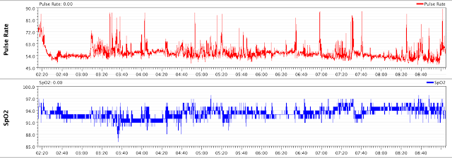 Jako „pulsoksymetr referencyjny” użyłem ResMed’owy Air 10 z profesjonalnym czujnikiem typu soft od NONIN. Analizowałem dane chwilowe, ich zmienność przy zmniejszonej saturacji oraz wyniki zbierane w trakcie nocy. To co zauważyłem w pierwszej chwili to „falowanie” wyników (szczególności pulsu) i spore artefakty. Myślę, że częściowo za to należy winić nietypowe miejsce dokonywania pomiaru. Aplikacja daje nam pewną wskazówkę na temat jakości sygnału i gdy o niego zadbamy większość problemów znika. Niestety niewielkie ruchy ręką potrafią momentalnie pogorszyć warunki pomiaru. Ale przy analizie wyników z całej nocy przestaje to mieć duże znaczenie, bo na wykresie wszystko jest ładnie uśrednione.
