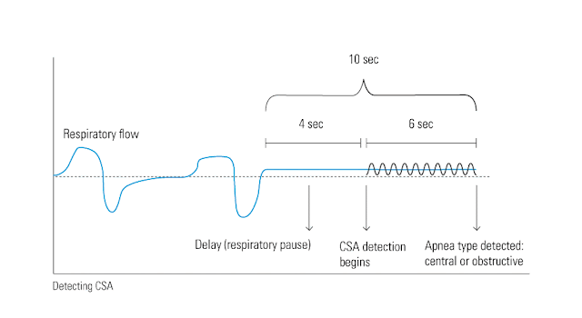 Jak urządzenia sobie radzą z rozpoznaniem bezdechów centralnych? Otóż urządzenie przez kilka sekund zaczyna „pulsować” powietrzem mierząc efektywne zmiany ciśnienia. W ten sposób jest w stanie policzyć objętość gazu i tym samym to czy drogi oddechowe są otwarte czy zamknięte. Bardzo sprytne!