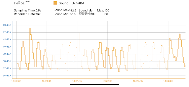 Górki ma wykresie to oczywiście są kolejne wdechy (wzrost ciśnienia w masce). Widać wyraźnie, że na wydechu głośność to około 37 dBA, na wdechu rośnie ona do około 40 dBA. W momencie gdy pojawiał się wyciek głośność rosła do ok. 50 dBA, a najwyższe natężenie zarejestrowanego dźwięku to 66 dBA (tyle co włączony odkurzacz!). Próba odizolowania szumu z maski pozwoliła czasowo obniżyć natężenie dźwięku do 36,6 dBA (max) i to jest najniższa możliwa wartość jaką udało mi się osiągnąć na tym zestawie i ciśnieniach.