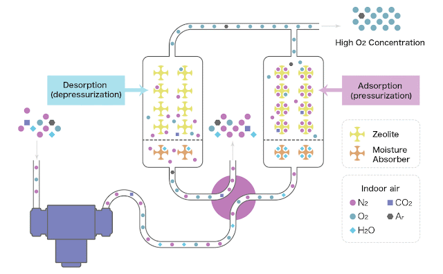 Zastanawialiście się jak działa taki koncentrator? Ja tak. Okazuje się, że jest to wbrew pozorom bardzo proste urządzenie. Jego głównym elementem jest komora wypełniona mieszanką zeolitu (tzw. sito molekularne), które pochłania z powietrza atmosferycznego azot i tym samym zostaje we wprowadzonej do kolumny mieszanki gazów głównie tlen. W powietrzu którym oddychamy jest aż 78% azotu i 21% tlenu. Oczywiście takie złoże nie jest w stanie pochłaniać azotu w nieskończoność, tak więc trzeba je regularnie regenerować zmieniając ciśnienie w układzie. I w taki sposób urządzenie oddaje w kolejnych cyklach mieszankę o zwiększonej zawartości tlenu albo azotu. Tlen jest podawany pacjentowi, a azot usuwany do atmosfery. Ponieważ zależy nam na tym aby tlen był generowany w sposób ciągły, dlatego zazwyczaj koncentrator ma 2 takie złoża i zawsze jedno generuje tlen, a drugie w tym czasie oddaje azot w cyklu regeneracji. Ładnie to widać na załączonym schemacie: