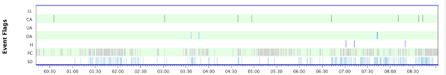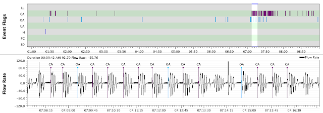 Patrząc na te dane można się przerazić ilością epizodów bezdechów centralnych pod koniec snu. Gdyby jednak sprawdzić w tym czasie saturacje prawdopodobnie okazało by się, że nie są to klasyczne bezdechy ale zaburzenia związane z wybudzeniami, które nie powodują obniżenia saturacji i nie są niebezpieczne. W badaniu polisomnograficznym te zdarzenia nie były by wzięte pod uwagę.