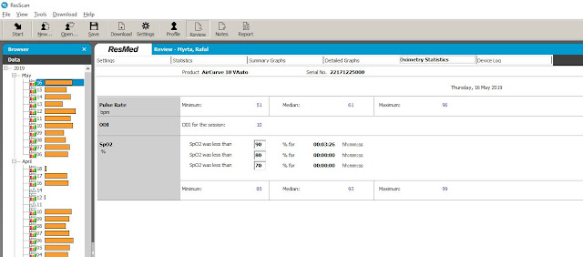 Brakuje tutaj niestety bardzo ważnego (a może najważniejszego) parametru jakim jest czas spędzony w desaturacji (możemy go sami policzyć z wykresu ale to kłopotliwe). Z pomocą przychodzi nam tu jednak ResMed’owy ResScan, który pokazuje te dane (i niestety nic więcej, co jest nieco rozczarowujące):