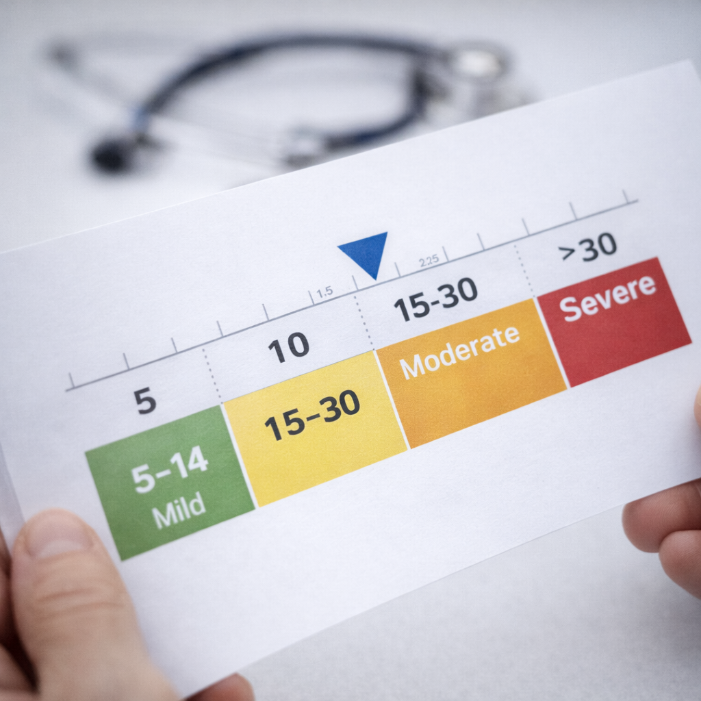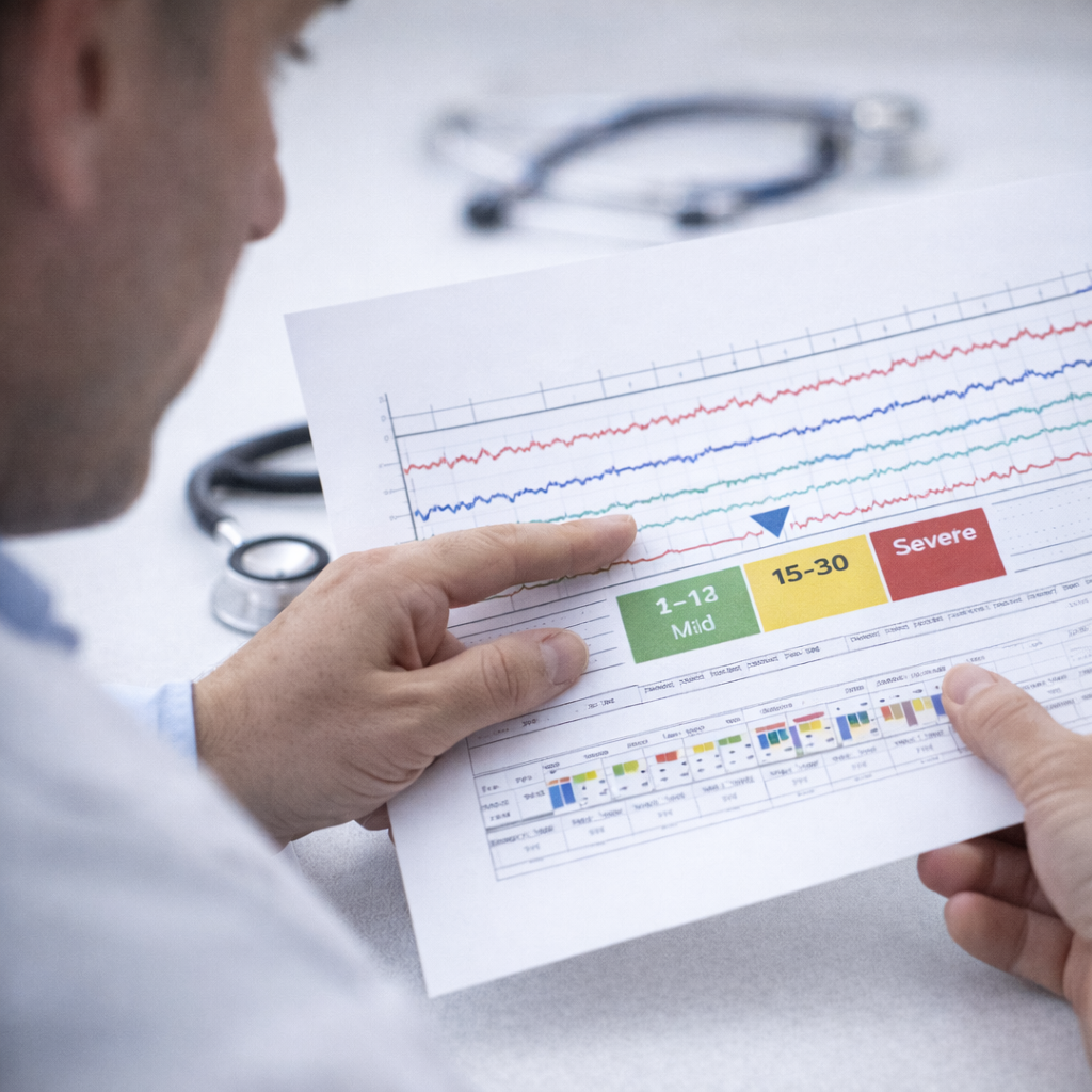 Najważniejszy wskaźnik to AHI (liczba epizodów bezdechu na godzinę snu). Ale AHI sam w sobie to nie cała historia. Liczy się też typ bezdechu (obturacyjny, centralny, mieszany), saturacja krwi tlenem, i kilka innych rzeczy, które opisuję poniżej