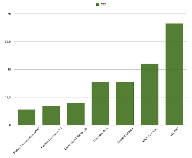 Apart from the AHI value, the indicators that clearly differentiate the effectiveness of the therapy is the ODI index (average 20.45, minimum 9.8 Philips, maximum 38.6 APEX).