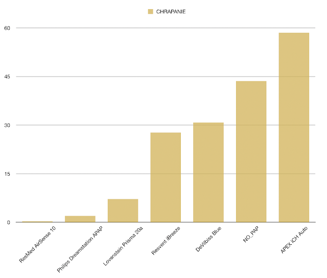 With a blue rectangle I marked the lowest effective therapeutic pressure determined by the manual titration method. It is clear that only Prisma „shot” into the range, and the vast majority used higher pressures. AirSense stands out here because, despite its relatively low blood pressure, it was able to effectively reduce snoring – so from a pressure/efficiency point of view it was the best. By titrating with a Philips machine we will achieve a lot higher than the required pressures.