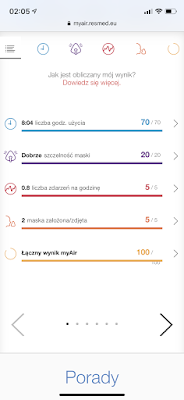Sama aplikacja jest zrobiona w taki sposób, że działa na każdej platformie. Można jej używać z komputera, tabletu czy telefonu- zawsze jest tak samo wygodnie. Głównym zadaniem tego programu jest motywacja do tego aby prowadzona terapia była możliwie najbardziej optymalna. Po każdej nocy zostanie nam przyznana punktacja w skali od 0-100, której wartość zależy od tego jak długo śpimy z CPAP, jaka jest szczelność maski, wskaźnik AHI i ile razy przerwiemy w nocy terapię. Aplikacja będzie nas motywowała do polepszania wyników i dawała wskazówki jak tego dokonać. To jest dla mnie druga kluczowa rzecz dobrej aplikacji i nikt tego jeszcze nie zrobił lepiej od ResMed.