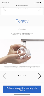 Ostatnim elementem aplikacji są porady. Zazwyczaj producenci nie przykładają dużej uwagi do tego elementu. ResMed zrobił tu kawał dobrej roboty i jego artykuły i materiały wideo są na prawdę dobrej jakości. Do tego są nam podsuwane w odpowiednim momencie, tak aby przeprowadzić nas przez okres adaptacji do terapii. Szczerze polecam! Porady znajdziecie w aplikacji, otrzymywać będzie je także w korespondencji e-mail.